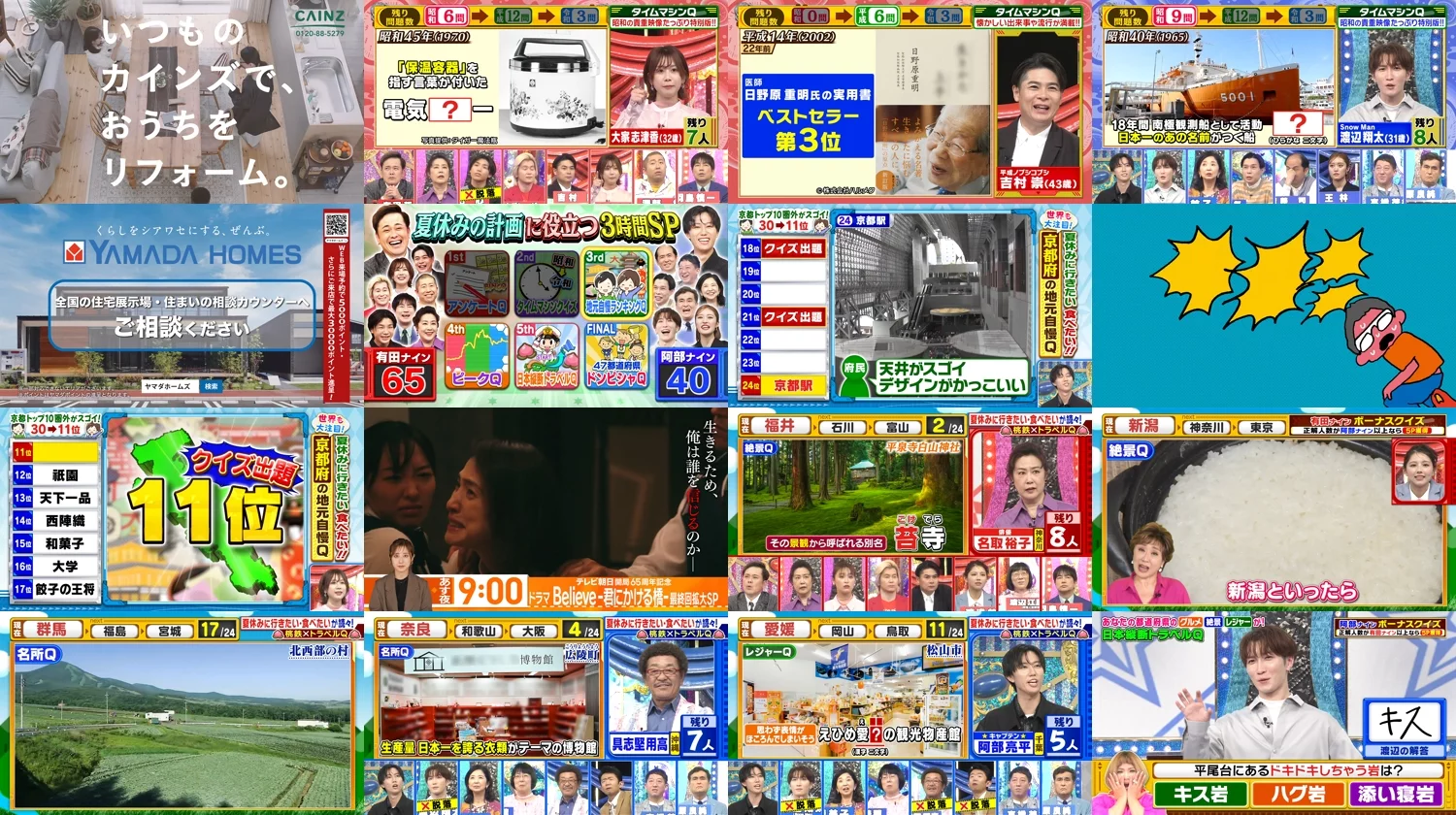 夏休みの計画に役立つ情報が満載だSP!京都の隠れグルメ&夏の名所20連発!羽鳥VS良純バトル「石原家がでちゃってる…」羽鳥の痛烈ツッコミ!昭和の貴重映像たっぷりタイムマシンQでは名取裕子の名推理が冴えわたる!日本縦断トラベルQに小林幸子&IKKOが珍入!?地元の絶景推しにハライチ&阿佐ヶ谷姉妹が大絶賛!さらに、スノーマン阿部が渡辺翔太に大クレーム…一体なにが!?