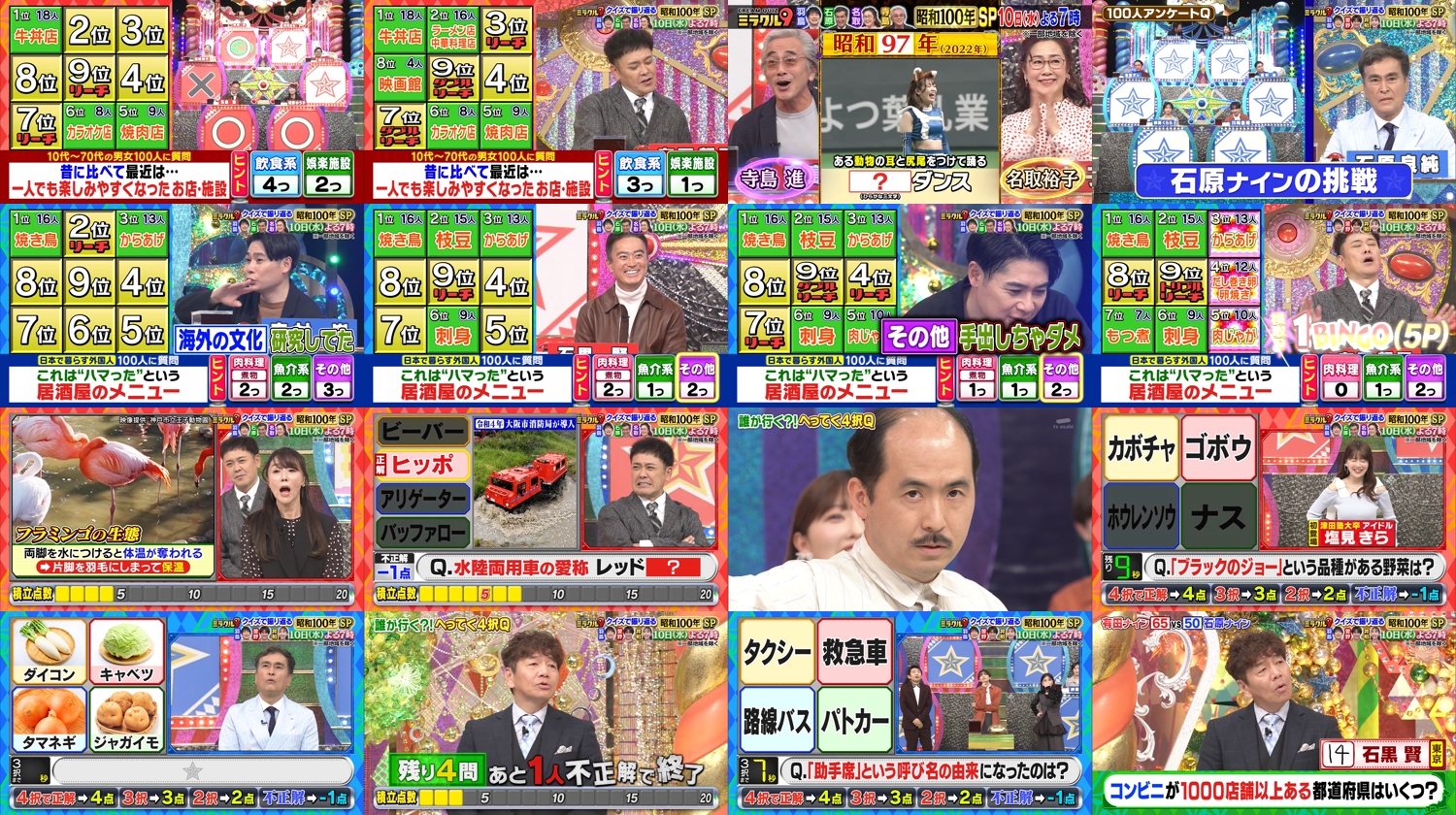 朝の情報番組「モーニングショー」から羽鳥慎一・石原良純・松岡朱里アナが参戦!今年は昭和100年のメモリアルイヤー!懐かし貴重映像で振り返りクイズを出題!アンケートクイズは昭和100年、テレビなどで話題になった生き物9!さらにレトロな写真をヒントに質問を続けて答えを導く“取り調べQ”も!