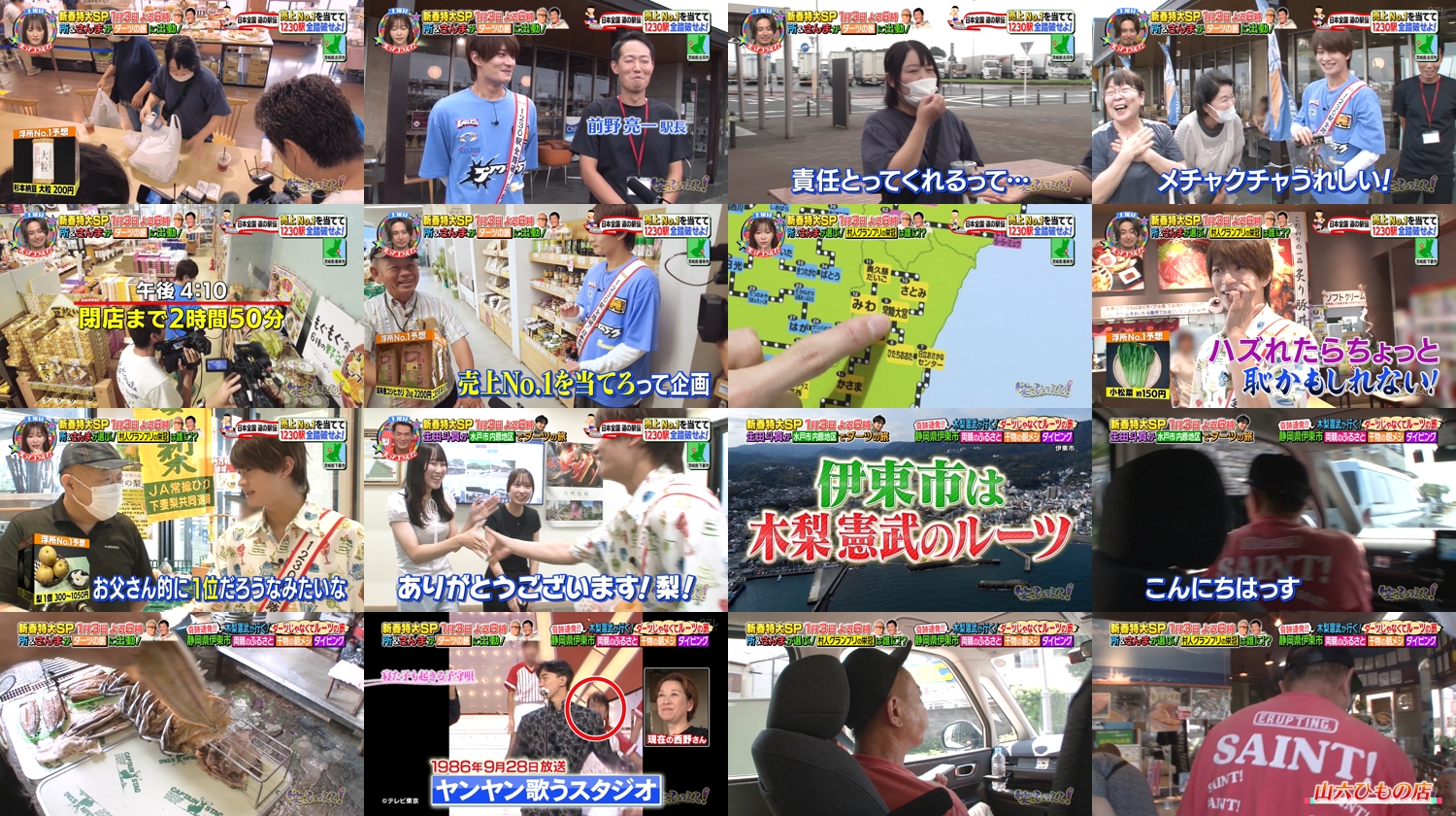 新コーナー「日本全国道の駅伝」スタート地点は農業王国茨城県!第1走者ACEesの浮所飛貴に課せられた使命は「売上1位の商品を当て次の道の駅へコマを進めろ!」1日3回補充!大人気新米&高級メロン&一口サイズの干し芋&ブランド梨&学校給食の定番お惣菜&名物納豆&毎日完売メロンパン▼木梨憲武が両親のルーツ静岡県伊東市でダイビング初体験▼1月3日夜6時からは所・さんまが大分で!&生田斗真が茨城でダーツ旅!
