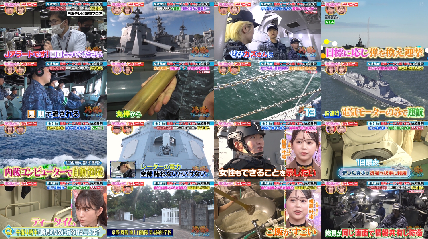 名前は聞くが全貌は謎だらけ…最新護衛艦イージス艦まやのミサイル迎撃訓練にTV初潜入!死角なしの最強SPYレーダー&命中率100%!?誘導装置FCSの情報で作戦を手書き作図&判断するCIC戦闘指揮所とは!?▽車200台分ガス燃料×電気で動くハイブリッドエンジンを民間人初カズ点火▽全11階層300人の生活…50kg無料アイス&蒸気で沸く海水風呂&激ウマ焼きたてあんパンに悶絶