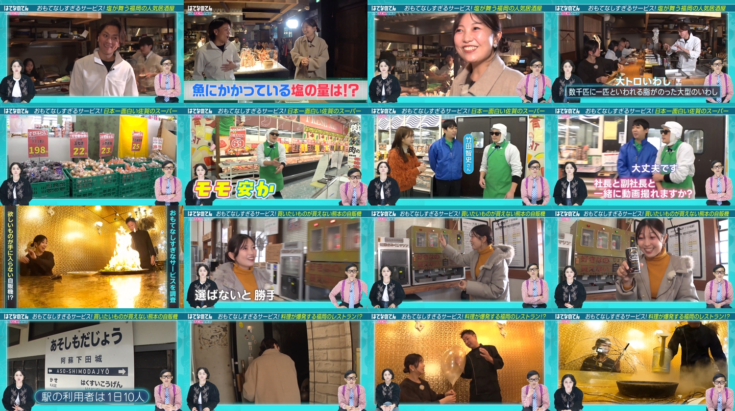 お客さんに喜んでほしい…そんな切ない思いからちょっとサービスしすぎじゃないかとも感じる、いろんな面白いサービスを紹介! 絶品グルメが話題の裏天神にある行列店では見た目もビックリなパフォーマンスをしていたり、日本一面白いと言われるスーパーでは社長・副社長たち自らがおもてなしのサービスを展開!? とある駅には何故かお客さんにとって挑発的な自販機が設置、そして黄金に輝く個室で提供される驚きの創作料理とは!